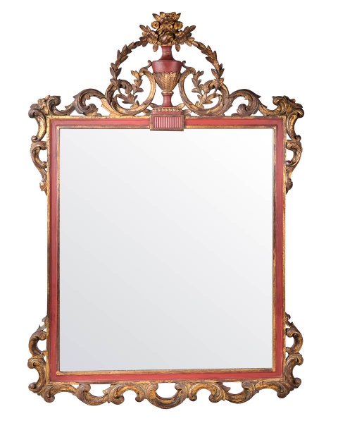 • Elegante de parede em madeira com folha de ouro, entalhada com espelho bizotado, 95 x 68 cm.