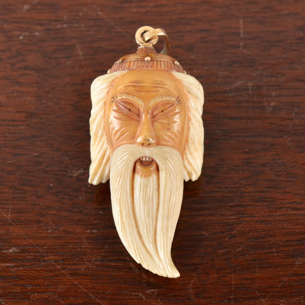 • Silvio Bretas - Pingente e broche em marfim esculpido à mão e ouro, reproduzindo o rosto de um Mandarim, assinado no verso, medindo 5,5 x 2,5 cm e peso total 13,8 grs.